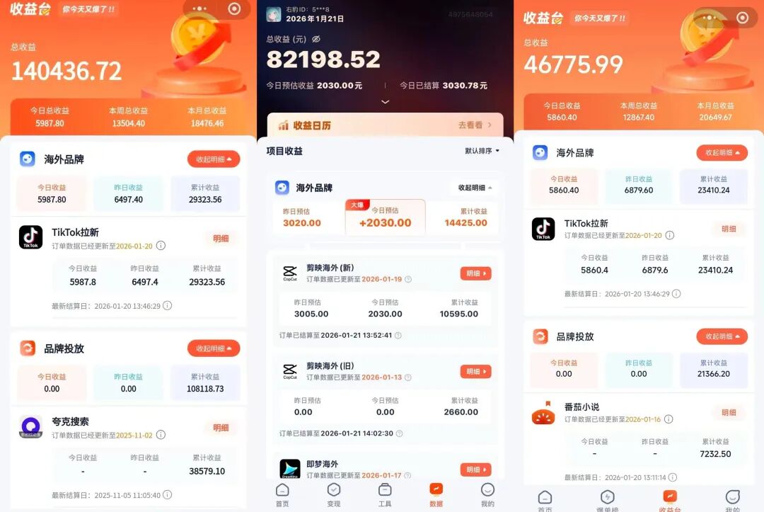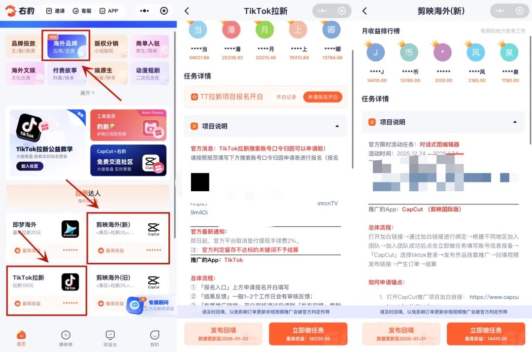 在右豹首页,点击【海外品牌】,往下滑就可以看到,这里面我们重点做的是剪映海外,还TikToK拉新这两个项目!