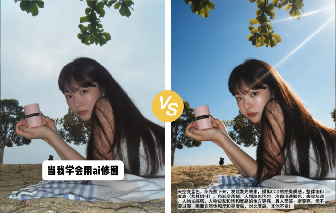 可以直接搬运最近流行的滤镜/拍摄风格,将AI指令直接加在图片上,并加上前后对比图。